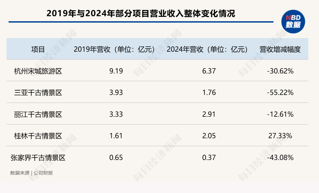 作为曾经的“现金牛”,杭州项目2019年营收超9亿元,2024年缩水至6.4亿元,收入减少了三分之一。此外,三亚项目收入腰斩至不足2亿元、张家界项目下滑超40%。